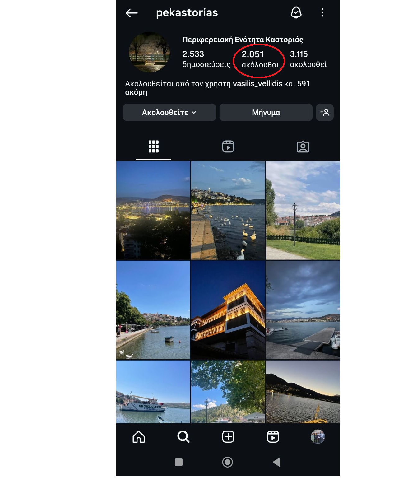 Ο επίσημος λογαριασμός της Π.Ε. Καστοριάς στο Instagram αριθμεί ήδη 2.051 ακόλουθους, με καθημερινές αναρτήσεις (πάνω από 2.500 δημοσιεύσεις) που προβάλλουν τη φυσική ομορφιά, τον πολιτισμό και τη ζωή της περιοχής.