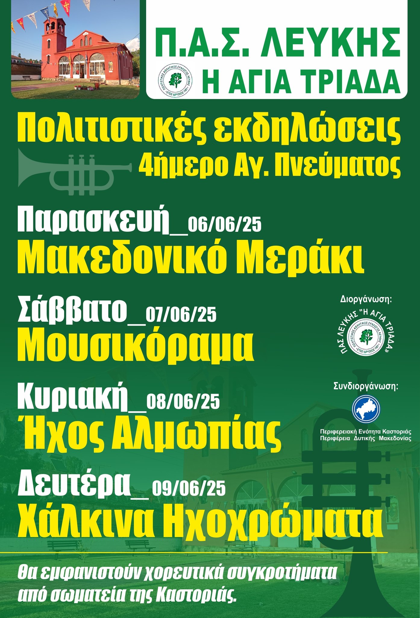 Ο Πολιτιστικός και Αθλητικός Σύλλογος Λεύκης «Η Αγία Τριάδα» προγραμματίζει την υλοποίηση τετραήμερου παραδοσιακού πανηγυριού, με αφορμή τον εορτασμό του Αγίου Πνεύματος, από τις 6 έως τις 9 Ιουνίου 2025, στον προαύλιο χώρο της εκκλησίας στη Λεύκη Καστοριάς. Η Περιφερειακή Ενότητα Καστοριάς συμμετέχει και στηρίζει τις πολιτιστικές δράσεις που προάγουν την παράδοση, την κοινωνική συνοχή […]